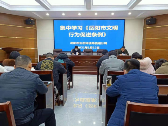 岳阳市生态环境局临湘分局2021年1月12日组织集中学习《岳阳市文明行为促进条例》提升党员干部职工文明法治意识,引导干部职工知《条例》、遵《条例》、守《条例》、践行《条例》,自觉讲文明、崇公德、守秩序、树新风,充分发挥《条例》的法制支撑和保障作用。