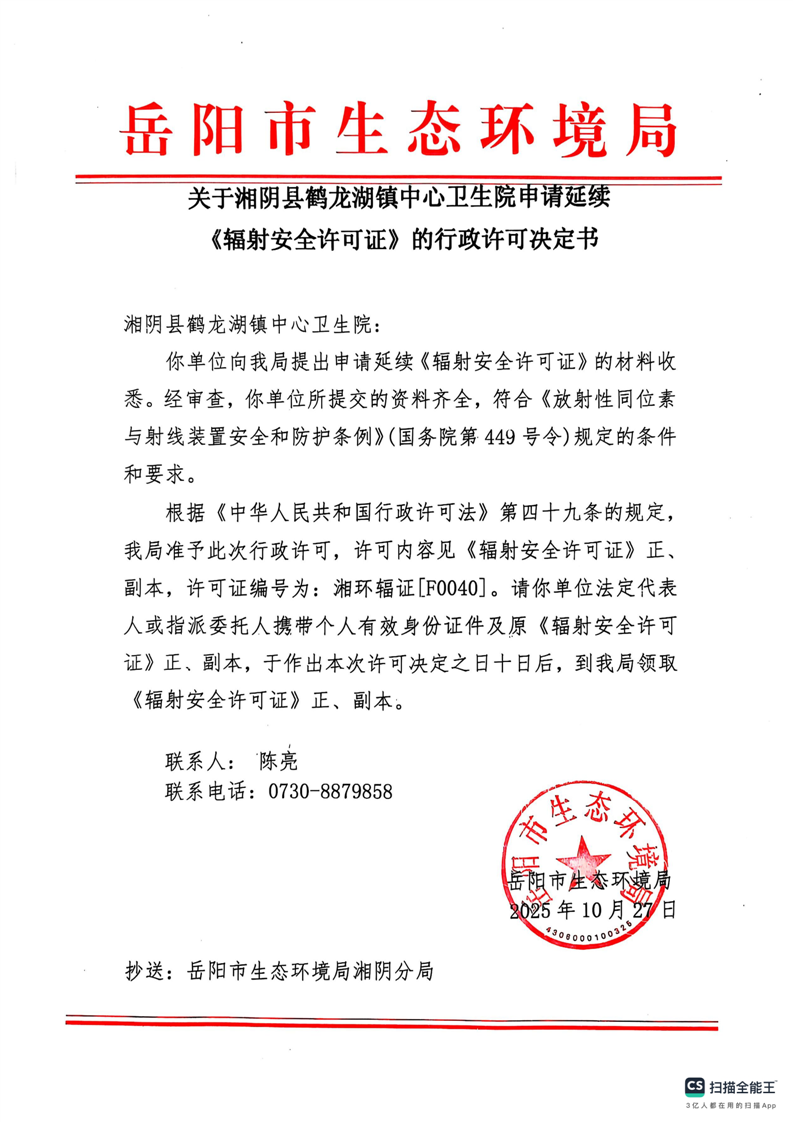 关于湘阴县鹤龙湖镇中心卫生院申请延续《辐射安全许可证》的行政许可决定