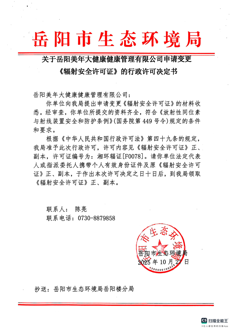 关于岳阳美年大健康健康管理有限公司申请变更《辐射安全许可证》的行政许可决定