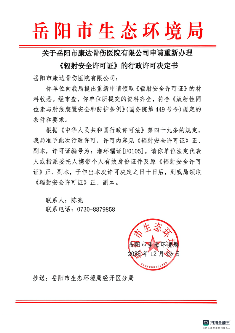 关于岳阳市康达骨伤医院有限公司重新申领《辐射安全许可证》的行政许可决
