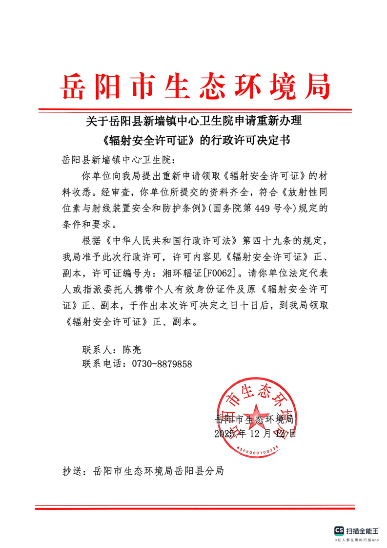 关于岳阳县新墙镇中心卫生院重新申领《辐射安全许可证》的行政许可决定