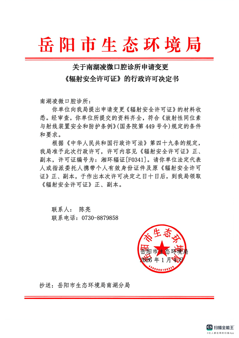 关于南湖凌微口腔诊所申请变更《辐射安全许可证》的行政许可决定