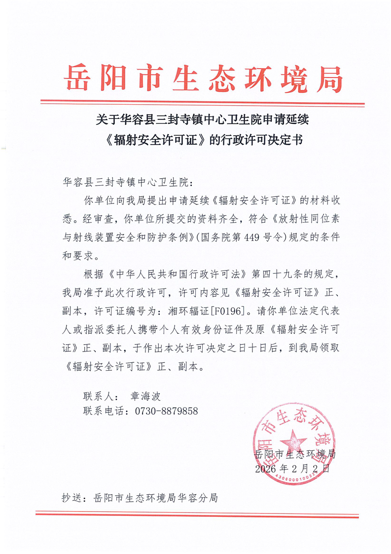 关于华容县三封寺镇中心卫生院申请延续辐射安全许可证》的行政许可决定
