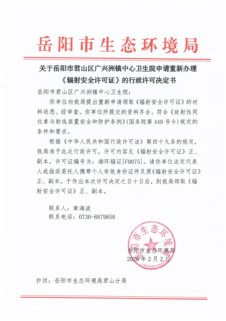 关于岳阳市君山区广兴洲镇中心卫生院申请重新办理辐射安全许可证》的行政许可决定
