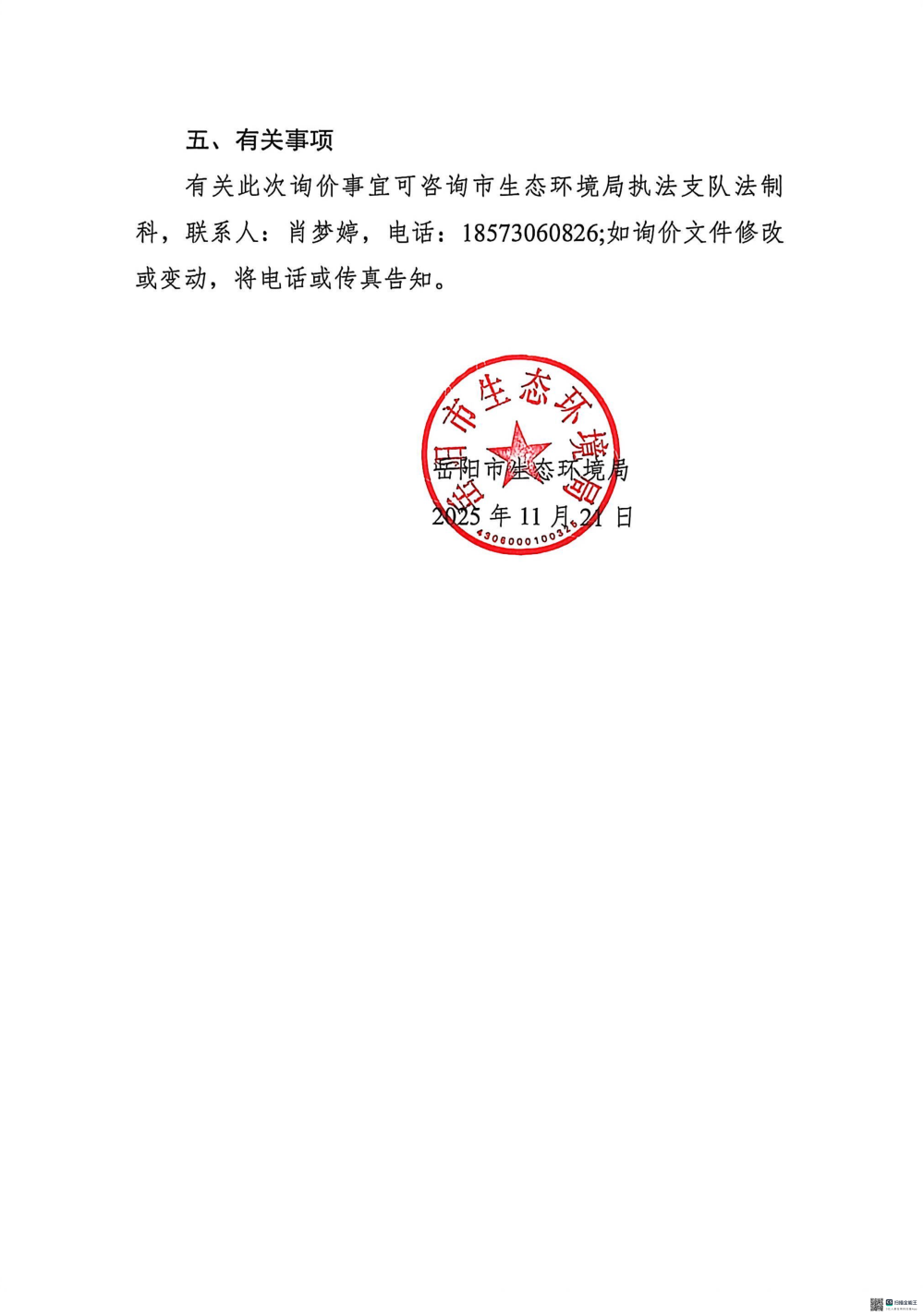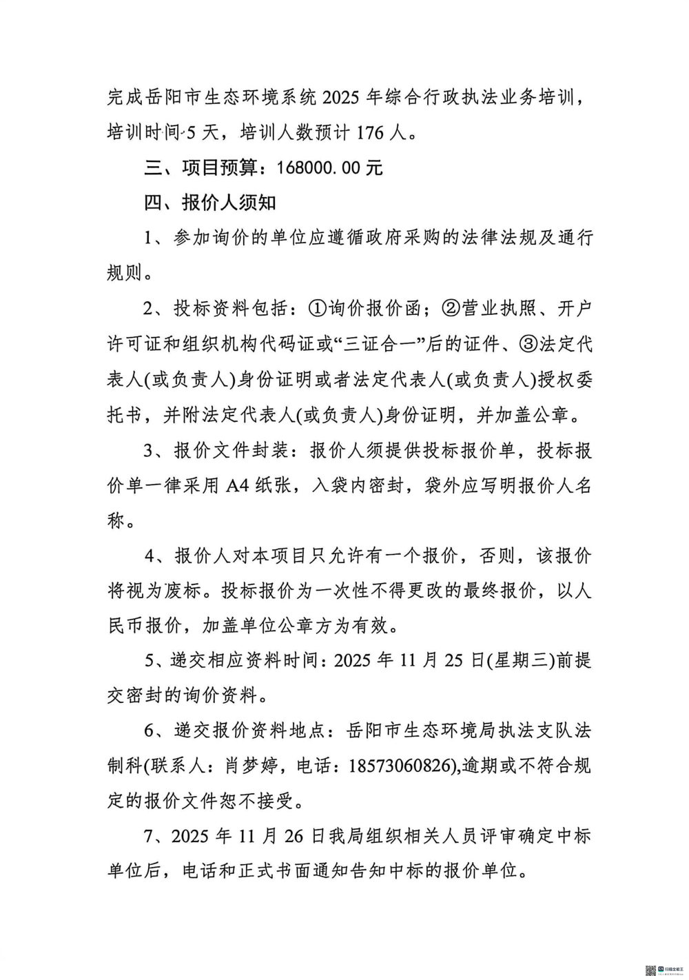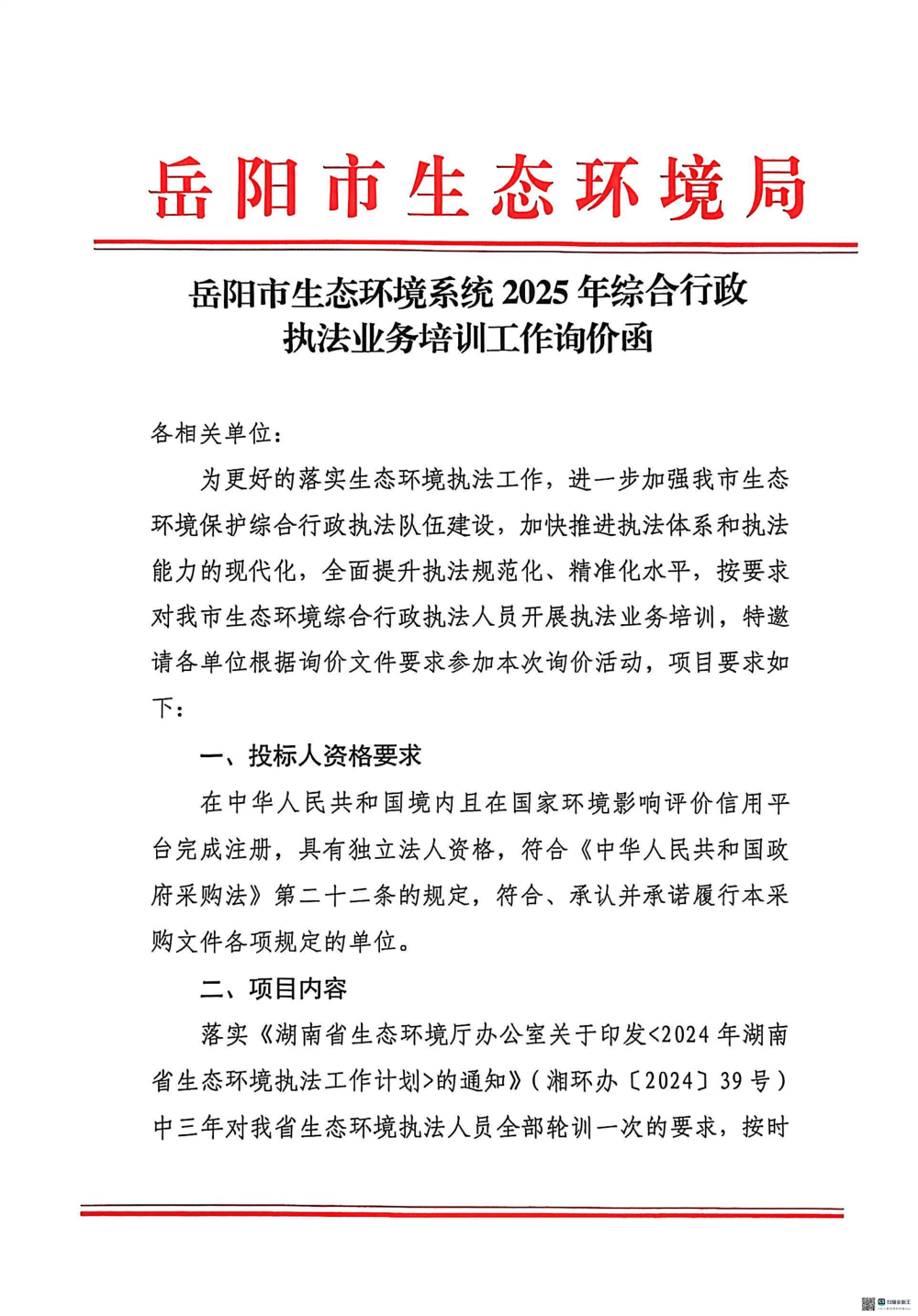 岳阳市生态环境系统2025年综合行政执法业务培训工作的询价函