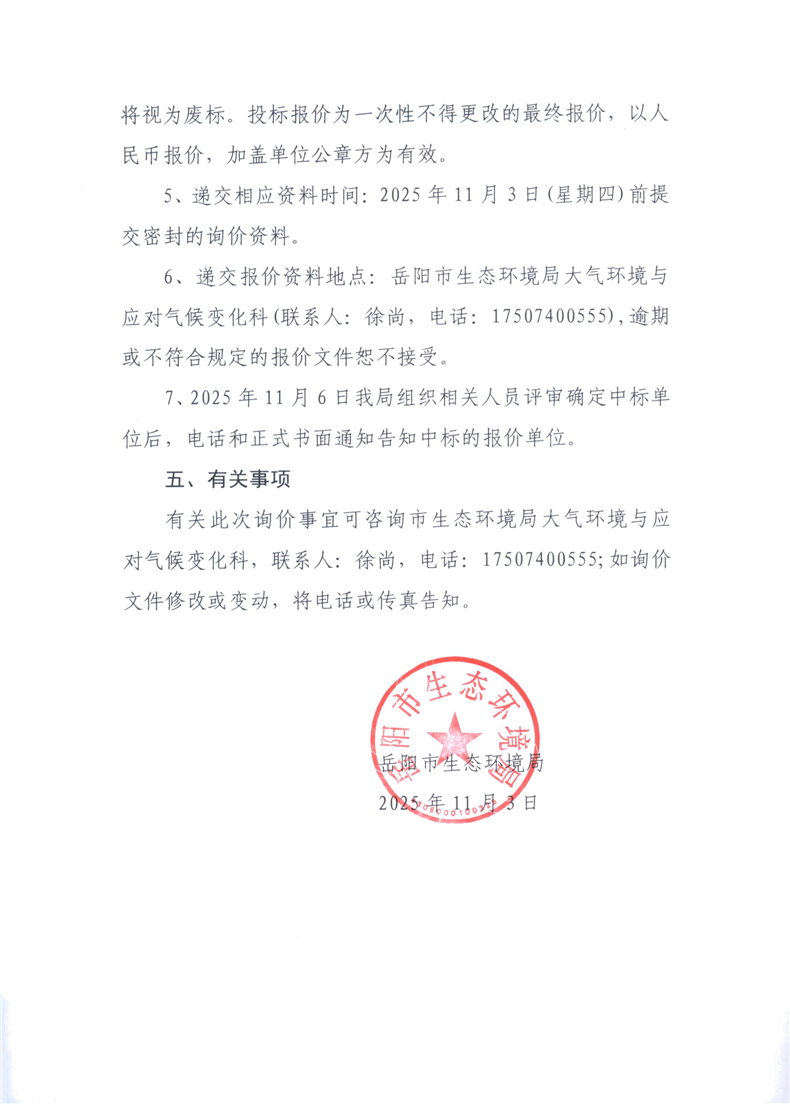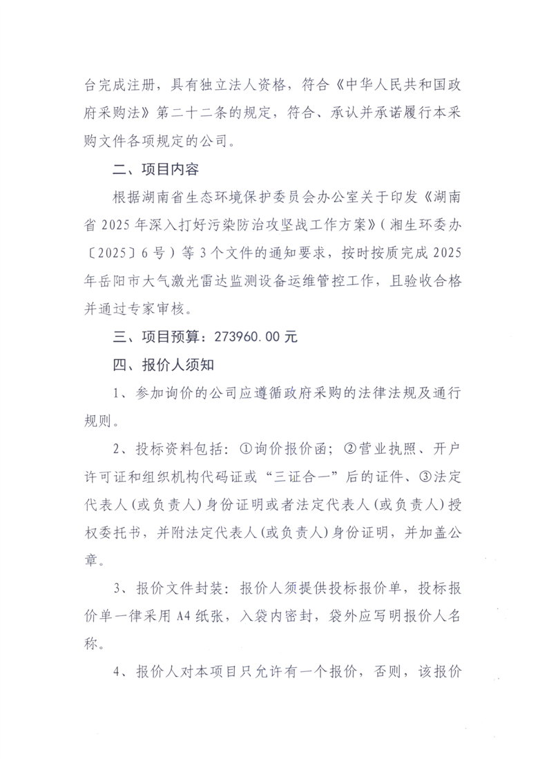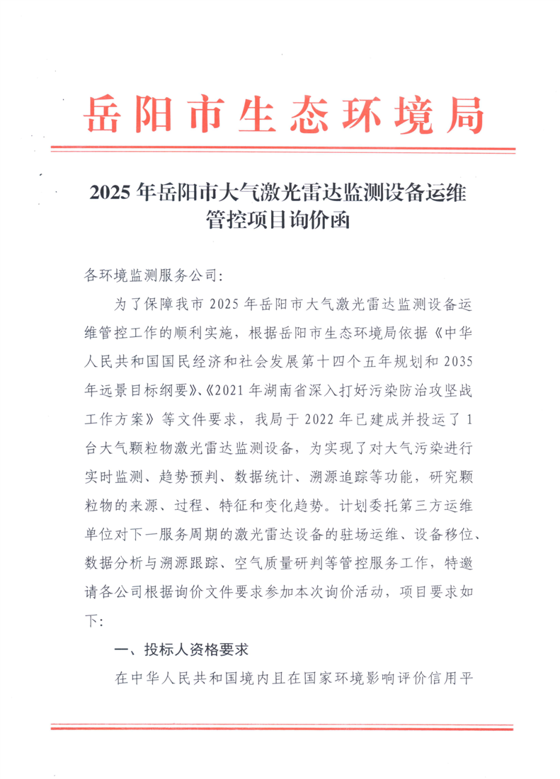 2025年岳阳市大气激光雷达监测设备运维管控项目询价函