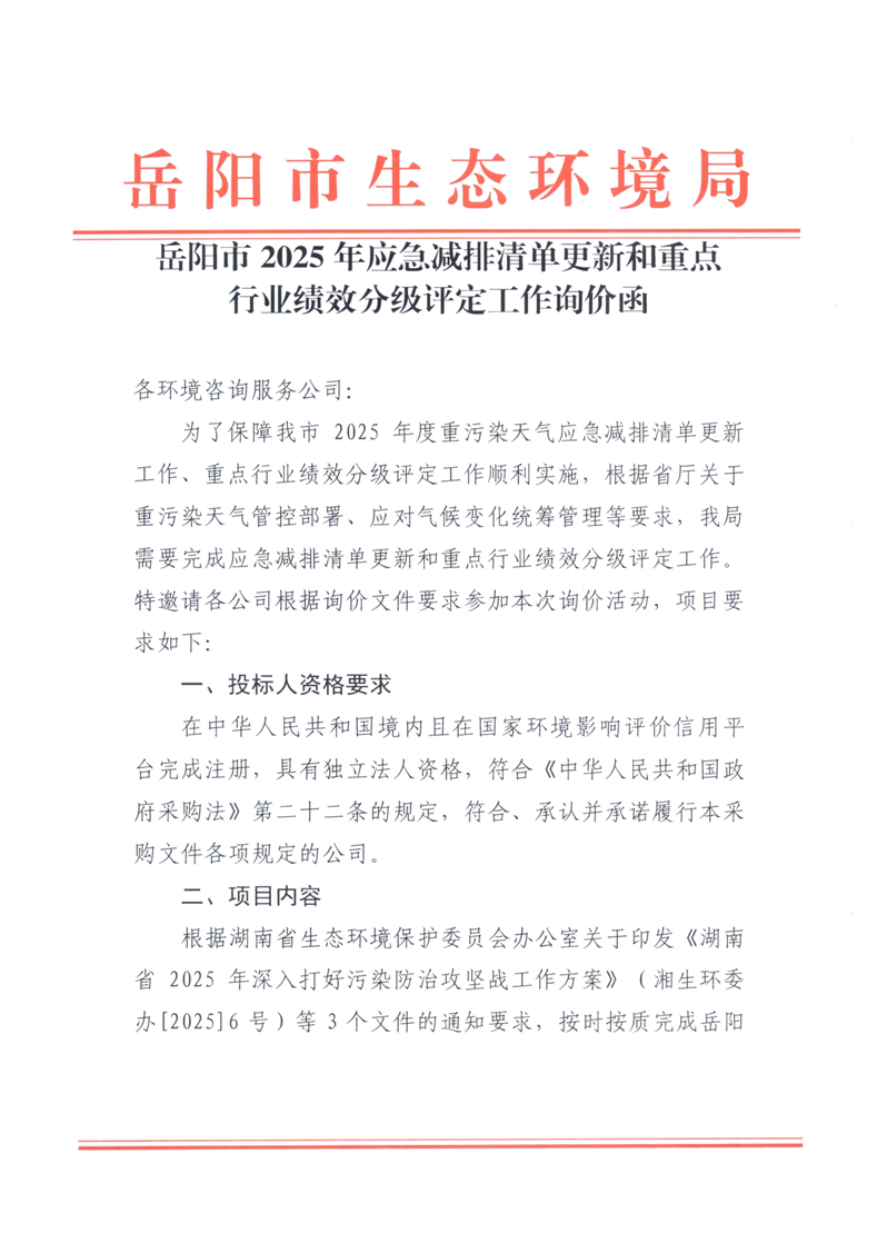 2025应急减排清单更新和重点行业绩效分级评定工作询价函