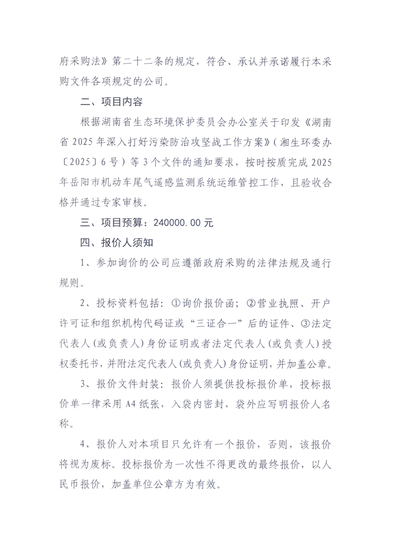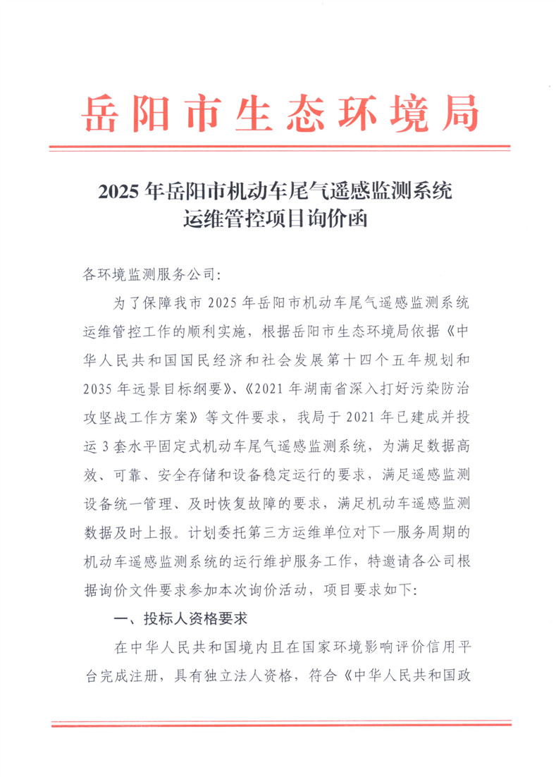 2025年机动车尾气遥感监测系统运维管控询价函