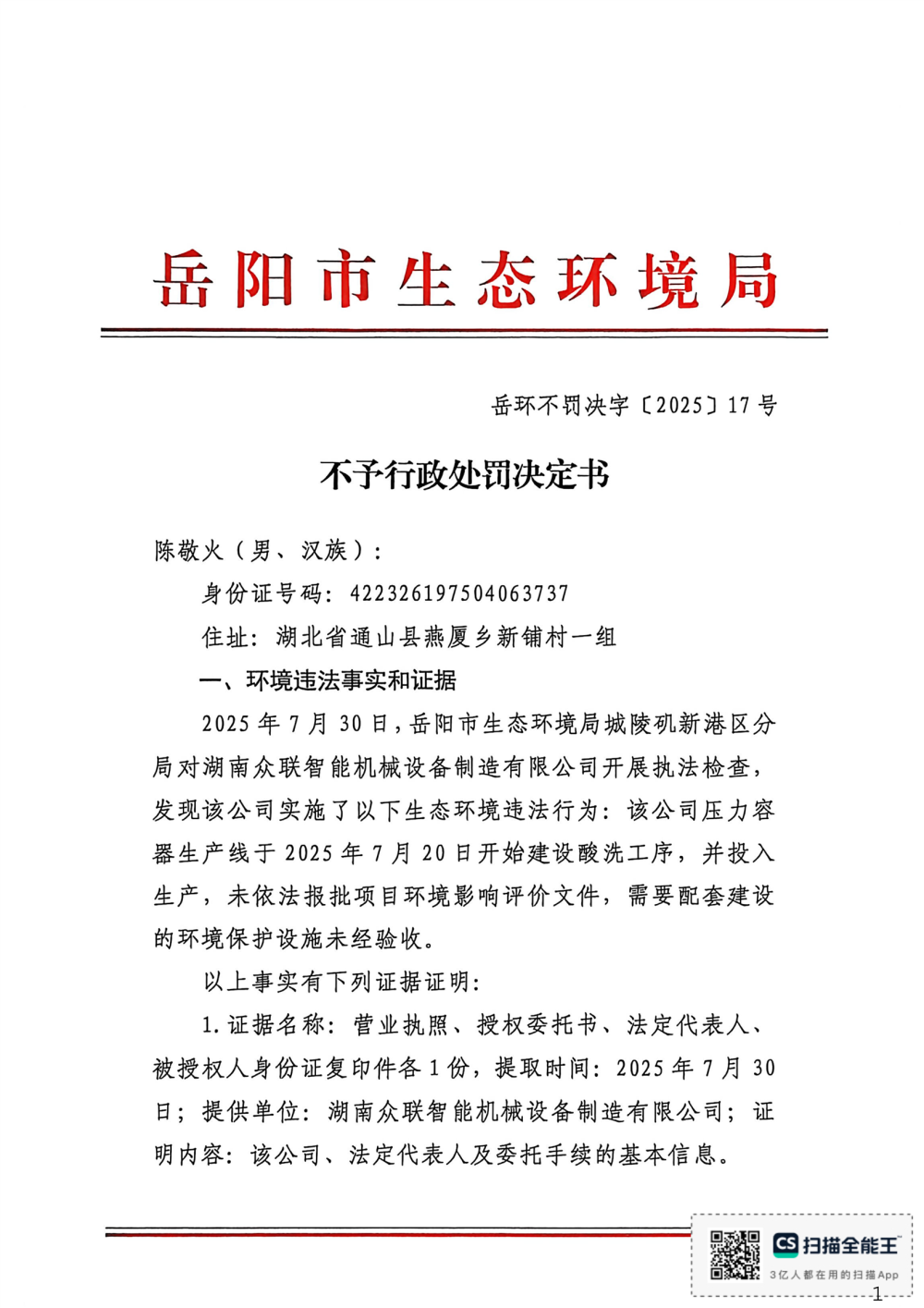 岳环不罚决字【2025】17号