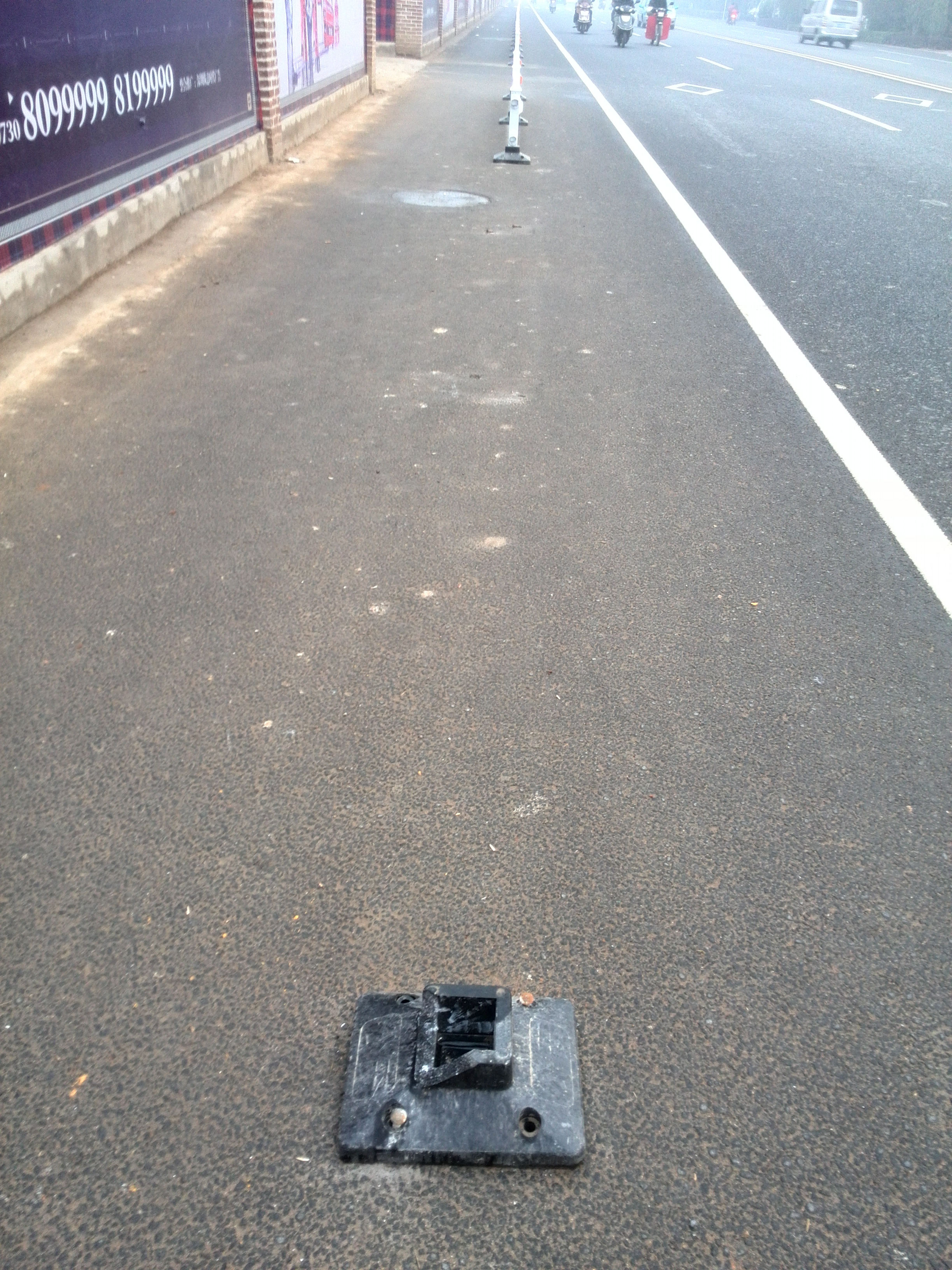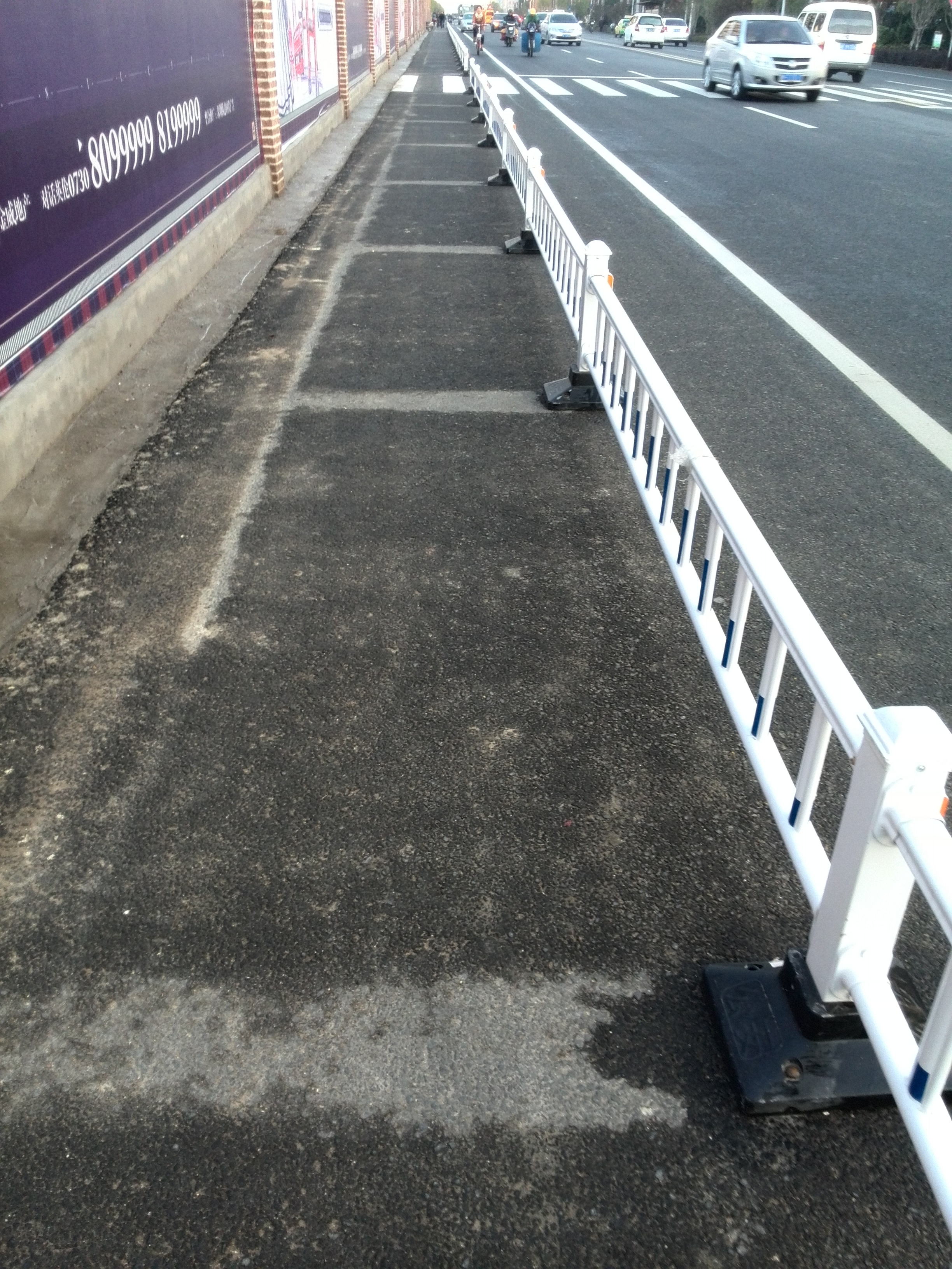 1、崭新的人行道防护栏已有50米被车辆撞坏,也足见这一路段的危险性,希望能尽快修复。(个人觉得费用应该由房产商支付)