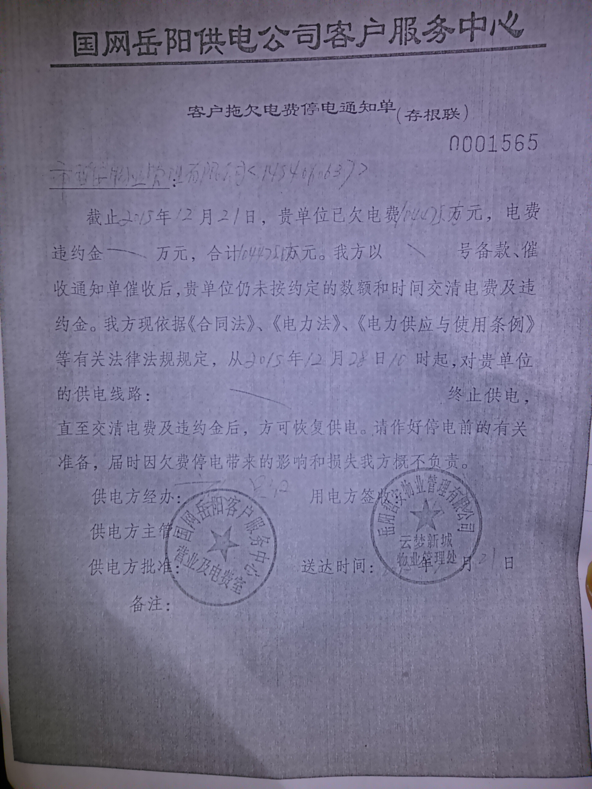 自2015年12月28日早10点开始,岳阳市求索西路云梦新城小区公共用电全面截断,至今无任何恢复供电迹象。目前小区公共路段全无亮,夜间全小区漆黑一片,成了岳阳西边的一坨黑斑,不仅影响小区居民夜间活动同时也给小区的管理治安留下相当的隐患。更严重的,本小区由17栋共31楼或18楼楼层的楼宇构成,由于公共用电的中断,高层水泵全部停止工作,目前所有楼宇4层以上居民家里全部断水,4层以上居民只能靠向底层邻居家借水维持最基本的生活用水,造成了全小区近千户居民非常糟糕的居家舒适感和极低的幸福度,目前小区内部已经是怨声载道,人心惶惶!