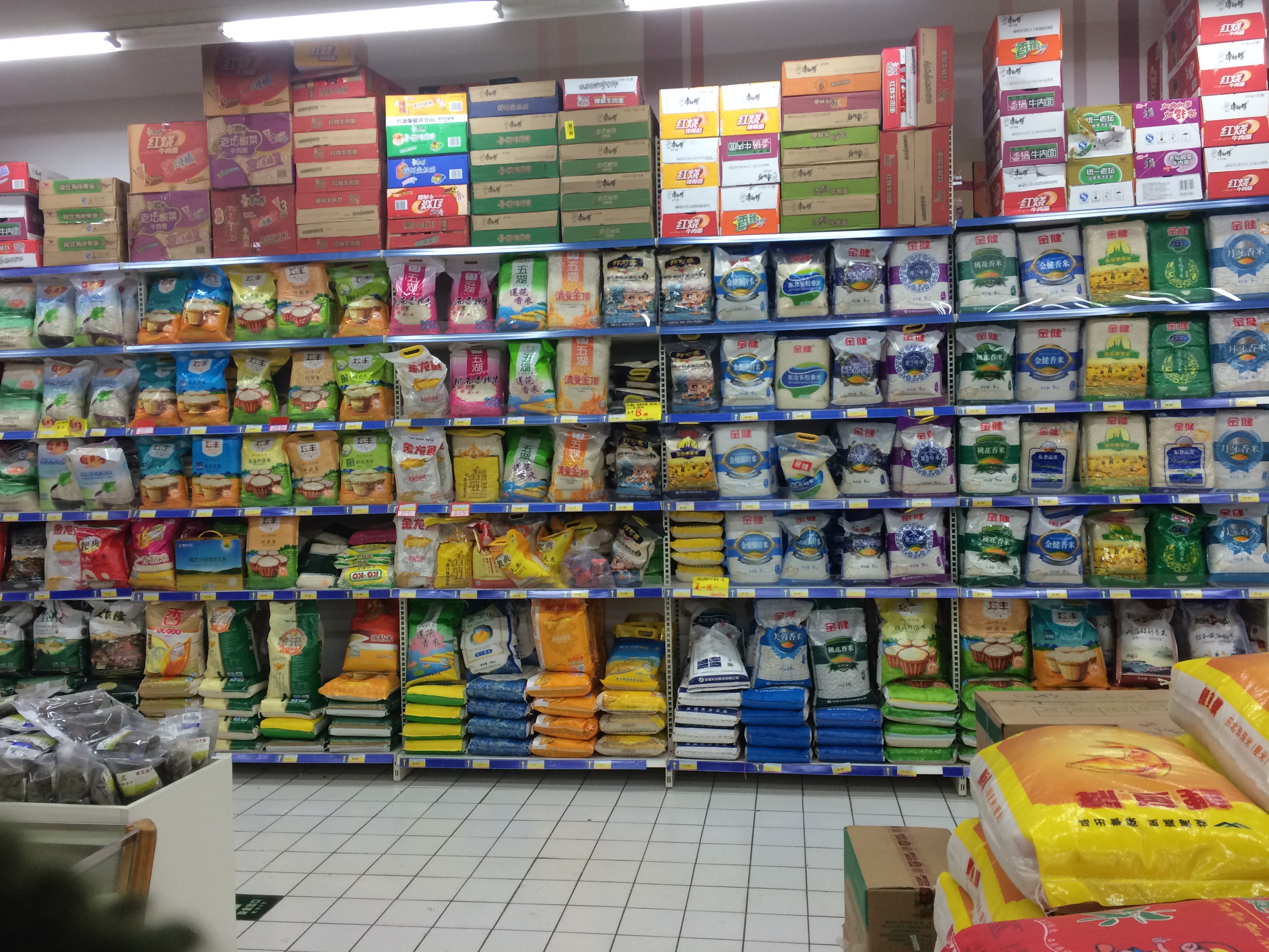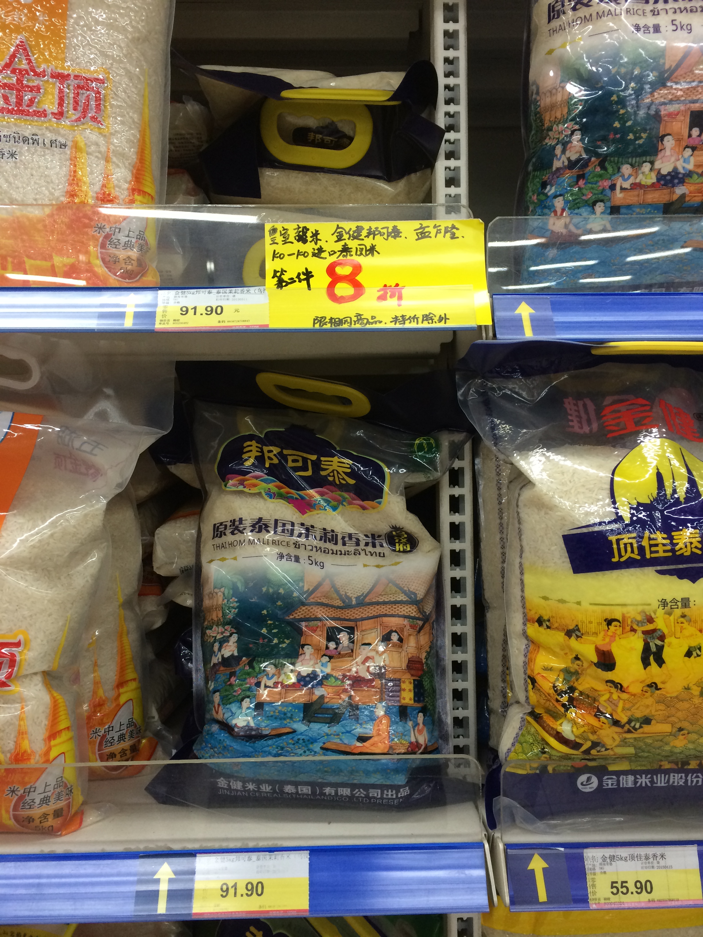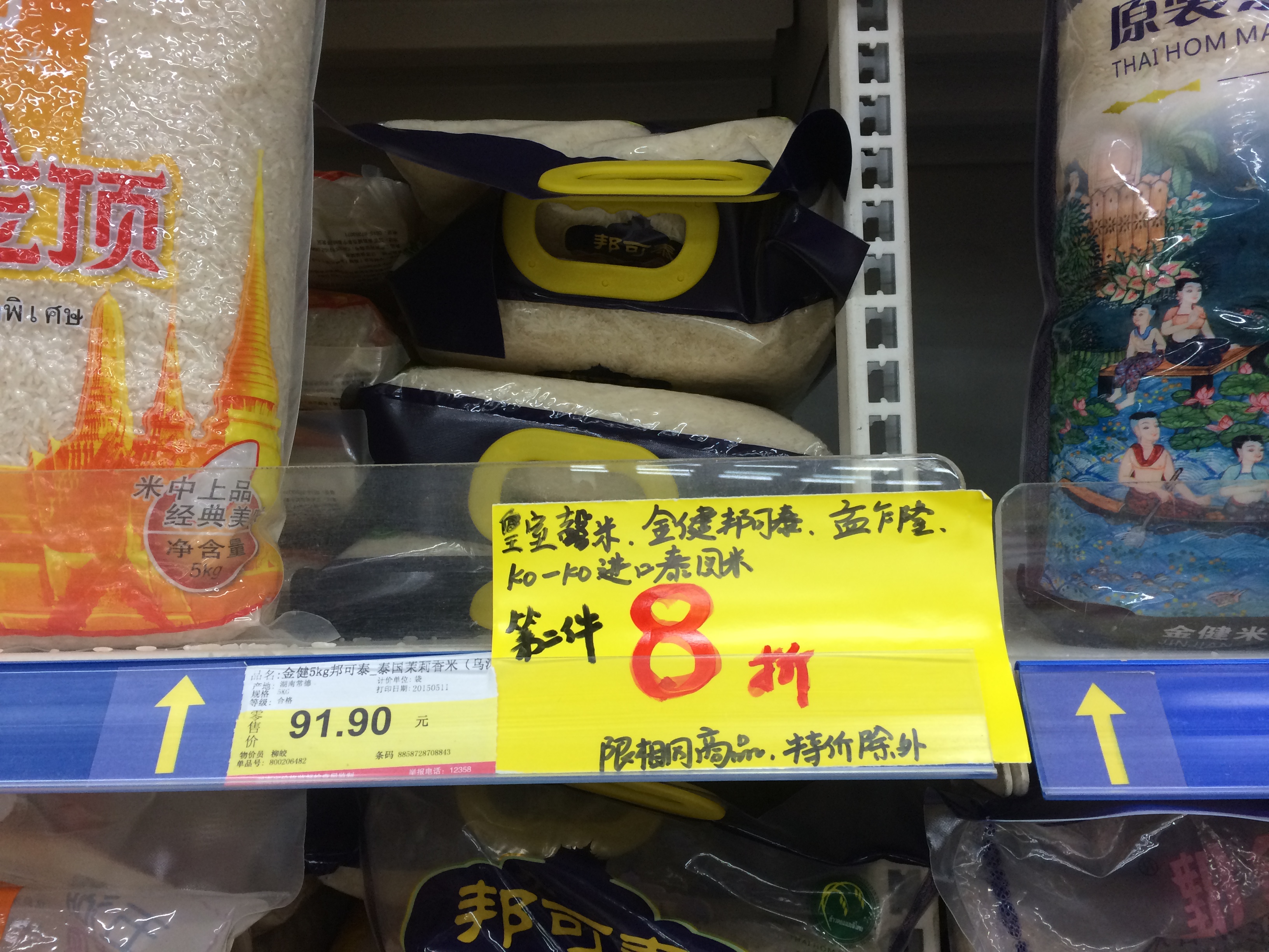 这家超市的米的货架上有种商品为金健邦可泰大米5KG装,货架上的促销牌说明了邦可泰的大米第二件8折,但是在柜台结账时,第二件未8折,收银员向相关负责人打电话询问,负责人也反复询问了是不是邦可泰。但是不知什么原因,最后收银员的回复是打8折的商品已断货,货架上的邦可泰乌汶府大米没有第二件8折,是另外一种叫金泰的大米才有优惠。