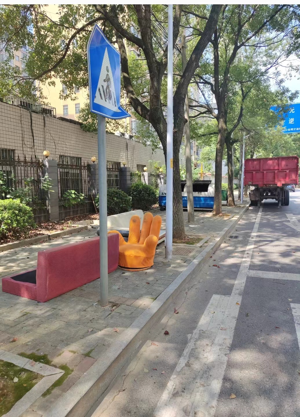 标题: 人行道摆放垃圾箱